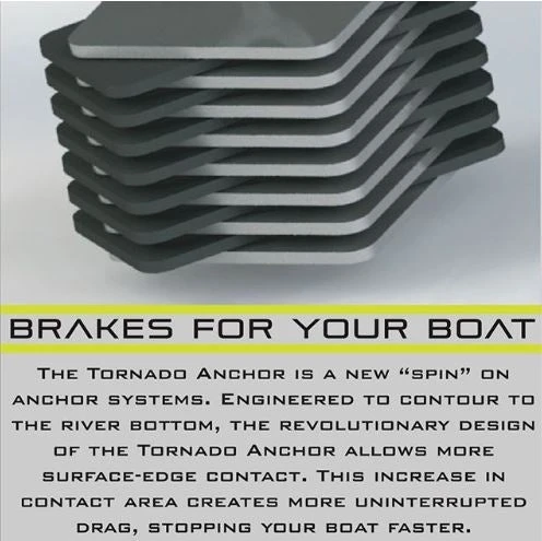 The Tornado Anchor is a new “Spin” on anchor systems. Engineered to contour to the river bottom, the revolutionary design of the Tornado Anchor allows more surface-edge contact. This increase in contact area creates more uninterrupted drag, stopping your boat faster.