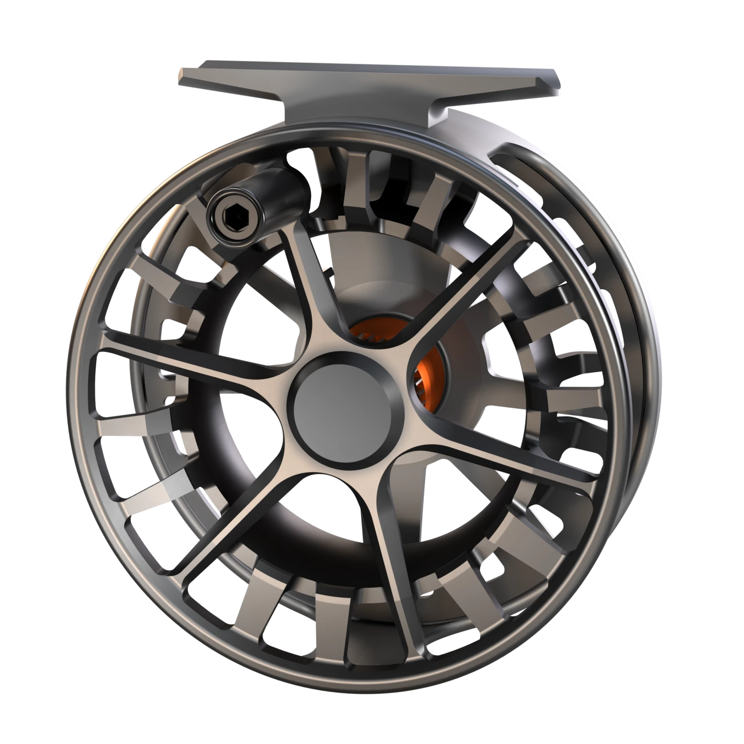 This reel has a “full frame” design allowing anglers with even the thinnest shooting line to fish without getting the line stuck between the reel and the spool. This style is preferred by anglers using two handed rods where mass weight isn’t an issue, but eliminating pull through and issues with thin mono running line is. We use the 7+ on many trout spey applications, rods 2-5 weight. For two handed rods 6+ we like the 9+ size reel.